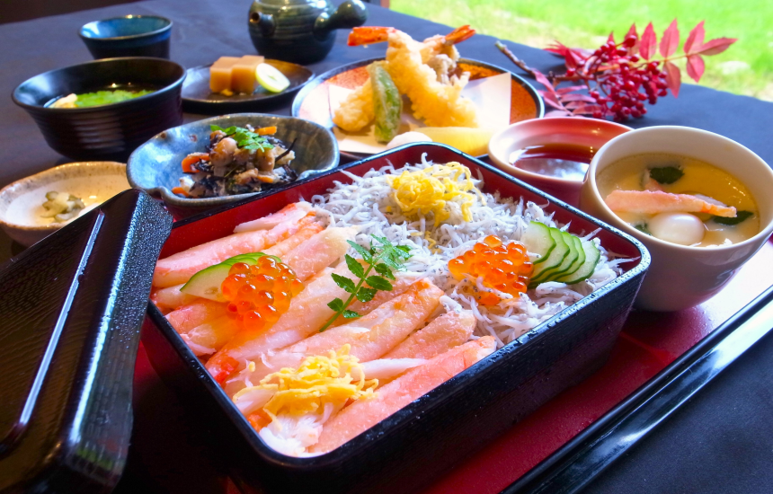小鉢 蟹の茶碗蒸し 蟹と海老の天婦羅 蟹と釜揚げしらす重 香の物 汁物 和甘味 日本茶
